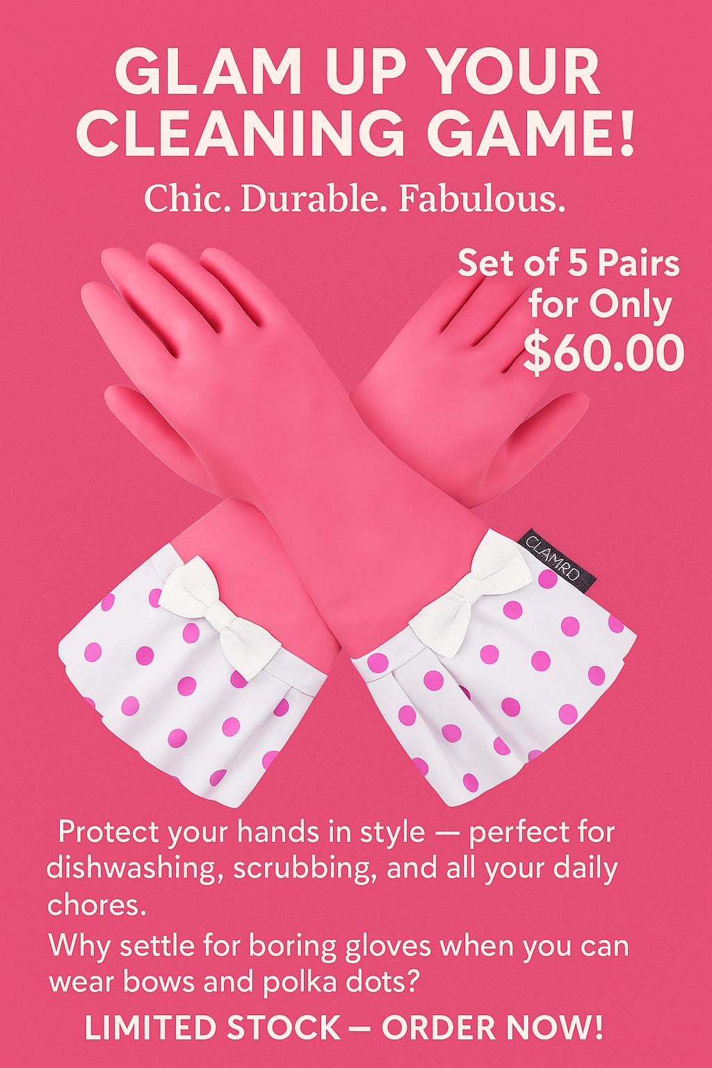 Glam up your Cleaning Game with our stylish functional dishwashing cleaning gloves. Be a Cleaning Queen and give new meaning to Cleaning! Perfect hostess gift! function meets fashion. 5 for $60.00 free shipping.