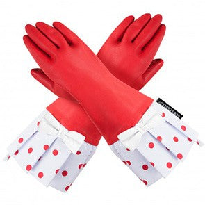 RED DISHWASHING GLOVE WITH RED POLKA DOT TRIM. SUR LA TABLE CUSTOMERS WILL LOVE THIS GLOVE . ITS LINED AND VERY THICK! FANCY GLOVES FOR FANCY GIRLS SUR LA TABLE Latex cleaning gloves.